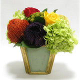 Preserved flowers in a hand-painted wooden container. A colorful addition to a bedside table, vanity, or coffee table.